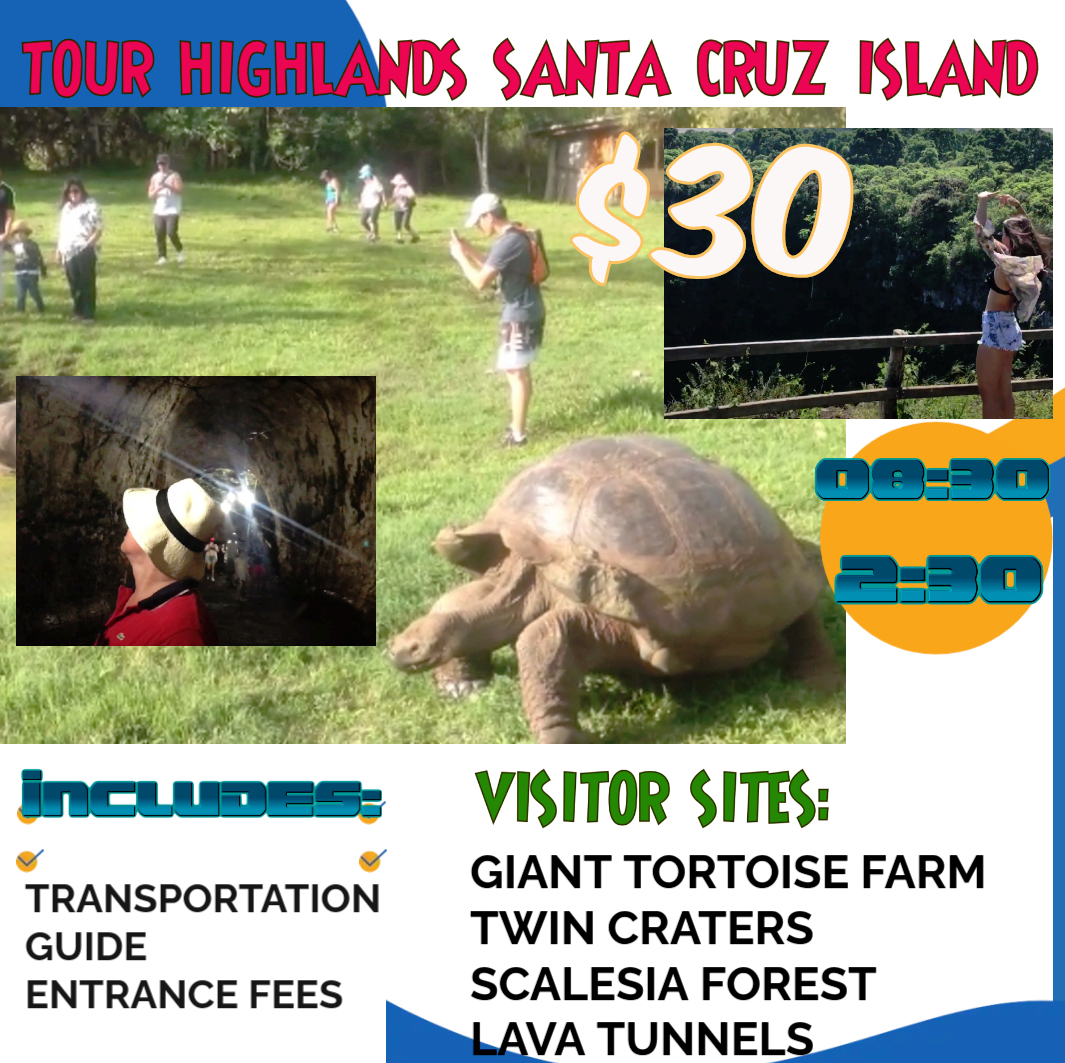 Half Day Tours from Santa Cruz Island – Puerto Ayora +593998518938 E-mail: info@galapagos.tv El Chato Giant Tortoises wild Reserve, Lava Tunnels, twin craters, with pick up on arrival day. $ 30 Private Transfer from your Hotel to Baltra Airport $ 25 Tour to Tortuga Bay Beach by Boat ROUND FARE and Kayak. $ 45