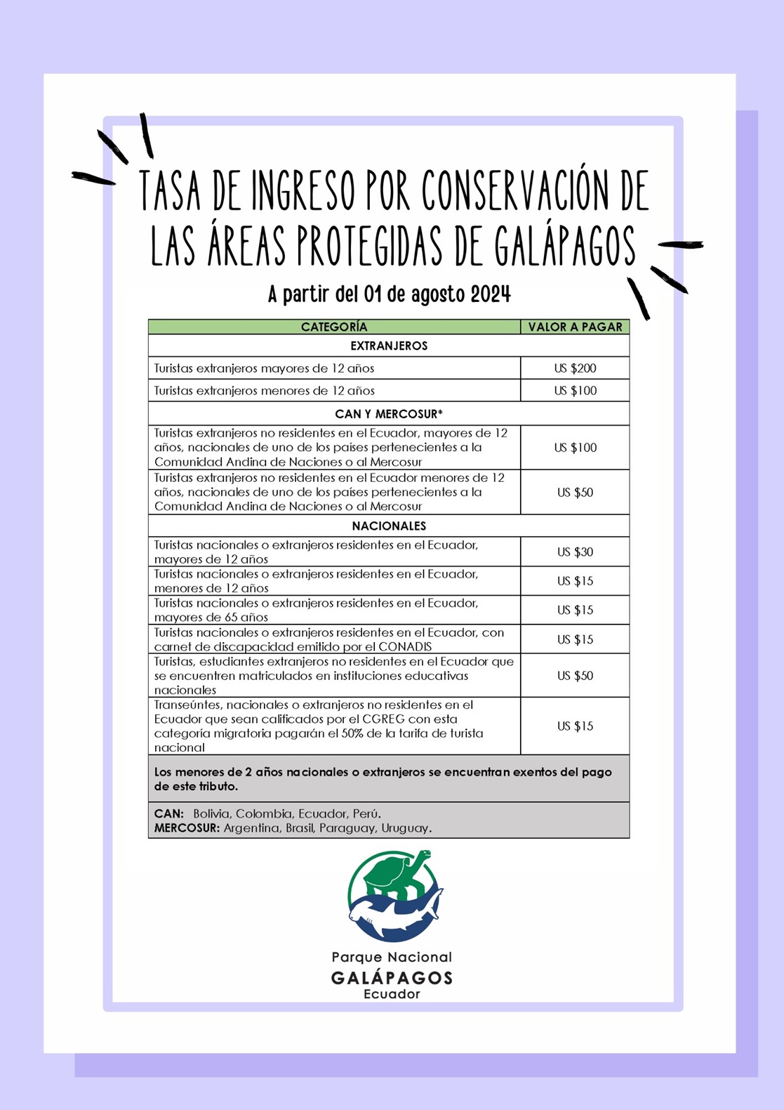 - Entrada al Parque Nacional Galapagos: $30 adultos /$15 menores de 12 años y tercera edad, Tarjeta de inmigración $ 20